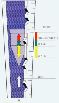 | 流量計測量原理 浮子式流量計是一種變面積式流量計,它通常具有一段直立的錐管和一只可以在其中自由的隨流量大小上下移動的浮子(如圖1)。當流體自下而上流經錐管時,流體的動能在浮子上產生的推力S和流體的浮力A使浮子上升。隨著錐管內壁與浮子之間的環形流通面積增大,流體動能在浮子上產生的推力S隨之下降。當推力S與浮力之和等于浮子自身重力G時,浮子處于平衡,并穩定在某一高度上,該高度位置對應的刻度指示流過流量計的流量。 |