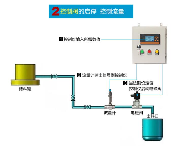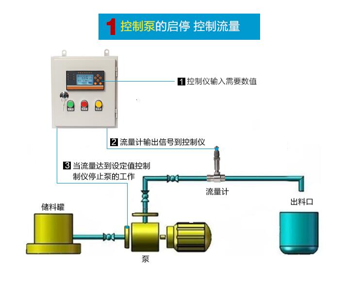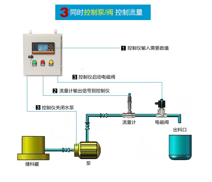 通過流量計(jì)測(cè)量流量 ,控制儀表接收信號(hào),在控制儀表里設(shè)置定量值。定量值達(dá)到后電磁閥、水泵 斷電停止工作。